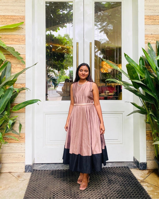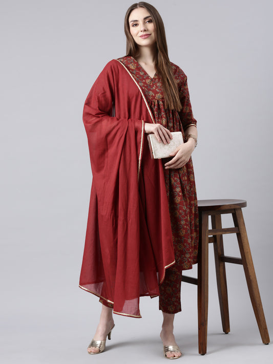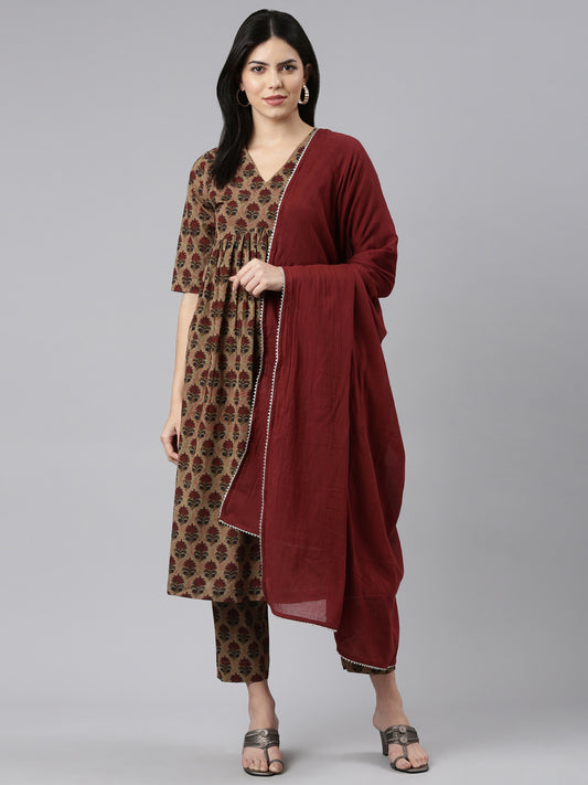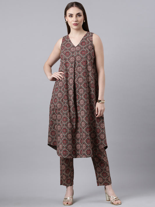 Taupe & Red Printed Cotton Flared Kurta Pant Set